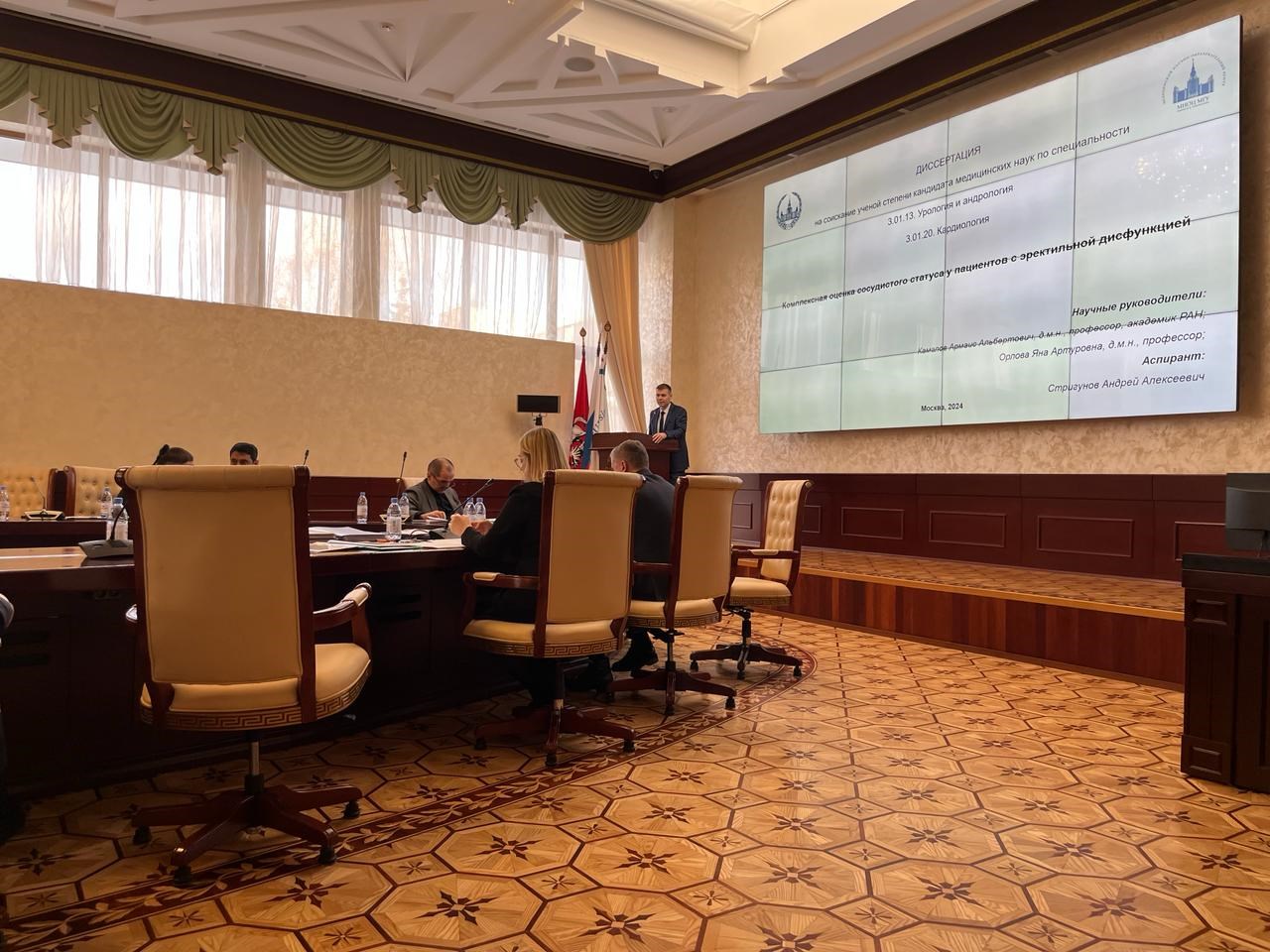 20 февраля 2024 года в Москве на заседании диссертационного совета на базе ФГАОУ ВО «Российский университет дружбы народов имени Патриса Лумумбы» успешно прошла защита кандидатской диссертации врача-уролога МНОЦ МГУ Стригунова Андрея Алексеевича. Диссертационная работа под названием «Комплексная оценка сосудистого статуса у пациентов с эректильной дисфункцией» была выполнена на кафедре урологии и андрологии факультета фундаментальной медицины МГУ им. М.В. Ломоносова под руководством академика Камалова Армаиса Альбертовича и профессора Орловой Яны Артуровны.